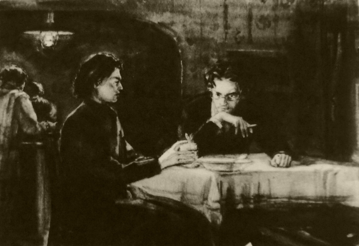 Место для разговора выбрано самое прозаическое – трактир, да еще и не отдельная комната, а «только место у окна, отгороженное ширмами», над чем иронизирует Иван, чувствуя, насколько расходятся тема диалога, возвышенная, неоднозначная – и место, где этим словам суждено быть произнесенными и услышанными.