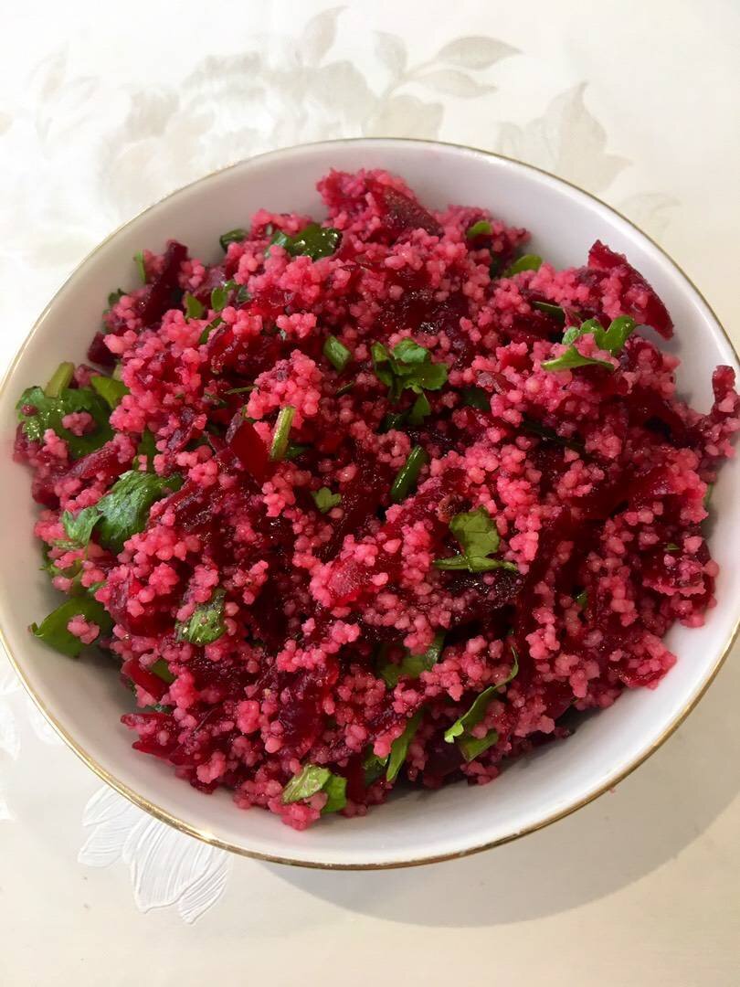 Ингредиенты: булгура (либо кускуса), кипятка, свеклы, укропа, петрушки, кинзы, оливкового масла, сок одного лимона, соль