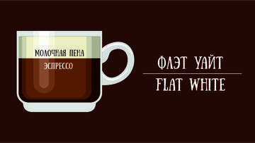 Кофе - Флэт уайт (англ. Flat white, «плоский белый») — кофейный напиток, родом из Австралии, придуманный в 80-х годах прошлого века. Напиток с бархатистой нежной текстурой и ярко выраженным кофейным вкусом.
