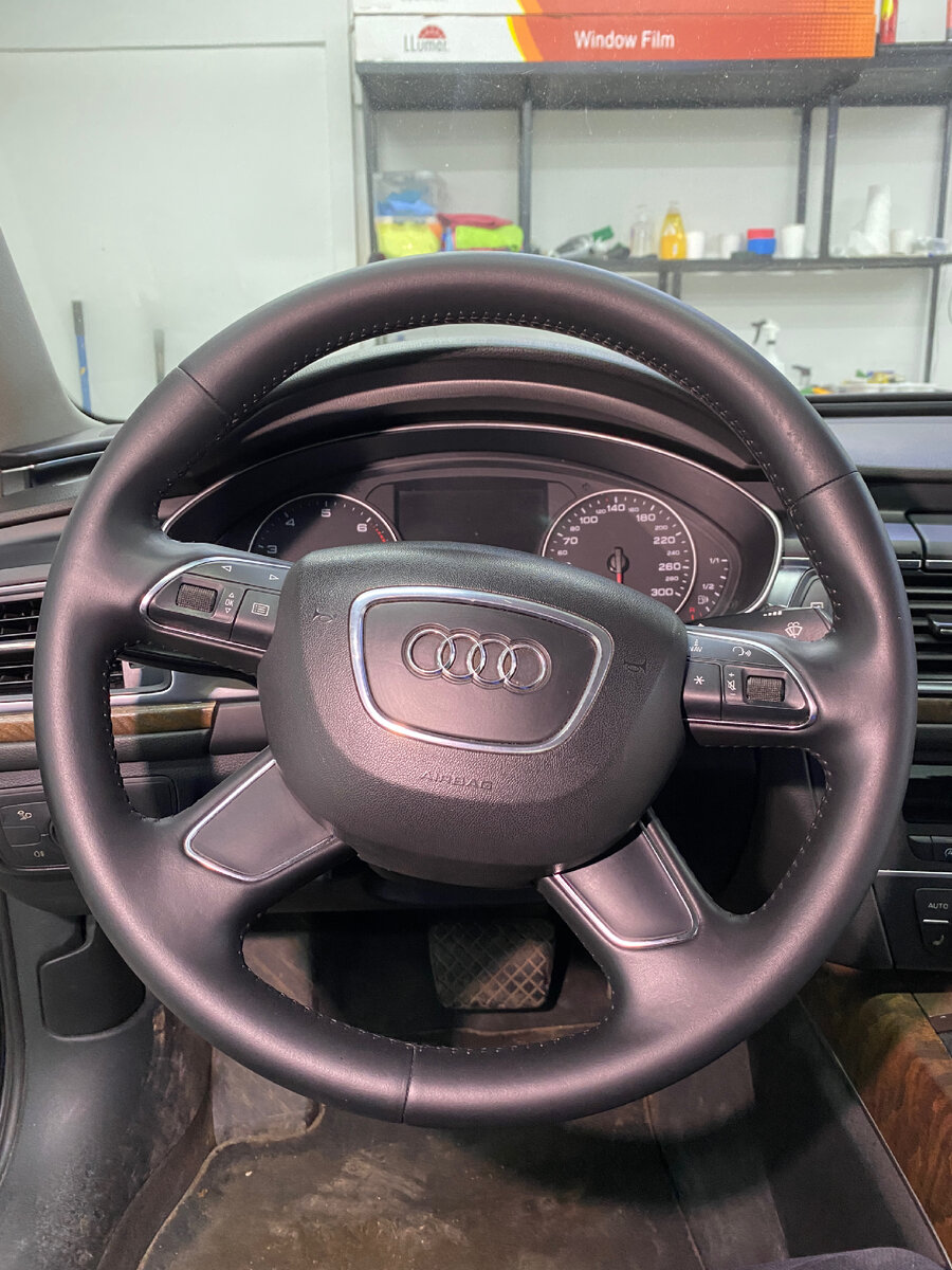 Всем привет))) сегодня покрасим руль))) просто чёрный, потасканный временем руль)) Хозяин просто хотел обновить вид руля для продажи))) конечно машина уже не первой свежести и надо было бы вытягивать жир из кожи, который накопился с годами, мы просто обновим внешний вид и исправим пару следов от колец, которые чувствуются рукой, когда проводишь по рулю) В первую очередь как всегда хорошо очищаем поверхность ))) тщательно все отмыли, обезжирили и готово) можно приступать к шлифовке неровностей))) При долгой эксплуатации машины, кожаный руль знатно потрепался и от кожи былой мало что осталось) проступили шероховатости, которые нужно ошкурить))) Так же на руле есть следы от колец, их так же можно зашкурить более грубой наждачкой и далее поверх пройтись более мелкой, для того, чтобы не было так же шероховатостей))) Таким образом мы просто стесываем кожу и следы стираются вместе с ней) На этом этапе нужно защитить остальные элементы салона от внезапного попадания краски на них) заклеиваем