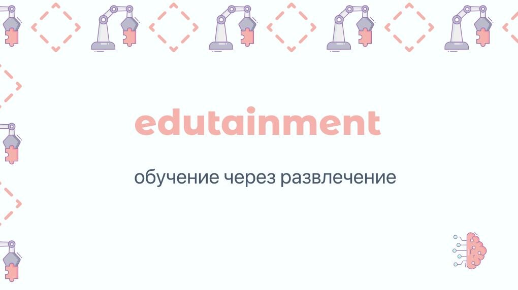 Что такое edutainment? Понятие edutainment (от англ. education — образование, entertainment — развлечение), обозначает «обучение через развлечение» и предполагает внедрение игровых практик в традиционные форматы учебы. Детям сложно продолжительное время концентрироваться на чем то одном, поэтому важно сочетать классические методики обучения с игровыми. Современная технология Эдьютейнмент стремительно набирает популярность. Технология носит игровой развлекательный характер и использует современные информационные и коммуникационные технологии в образовательном процессе. В современном мире востребованы универсальные навыки наравне с предметными знаниями. Необходимо тренировать такие навыки уже в детстве. Цель Основная цель эдьютейнмента — повысить мотивацию учащихся к учёбе, сделать процесс усвоения знаний более увлекательным, разнообразным и доступным. Такой подход к обучению предполагает реализацию когнитивного процесса, как интересное и полезное развлечение в сочетании с приобретением