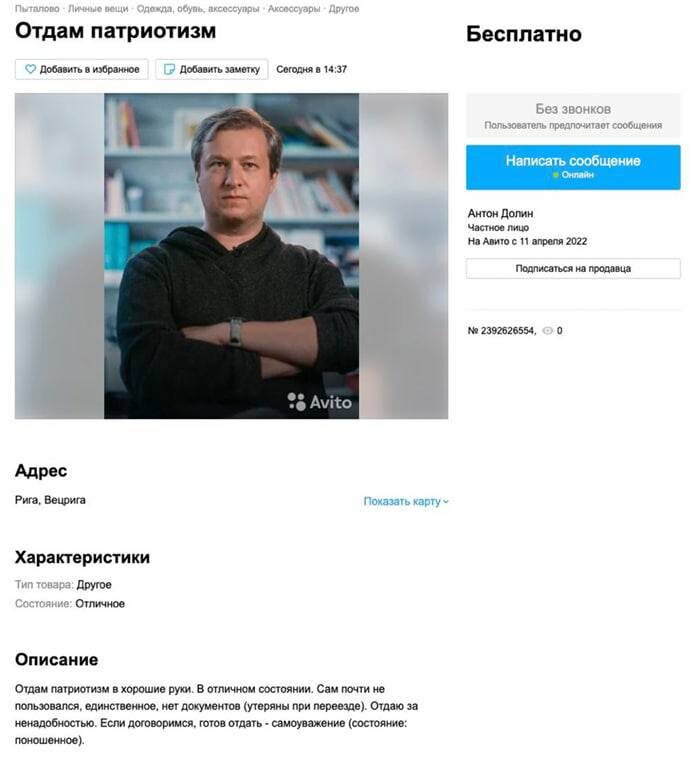 «Как сообщает Telegram-канал Ксении Собчак "Кровавая барыня", кроме Фейса в реестр иноагентов внесли адвоката Марка Фейгина, писателя Андрея Филимонова, историка Дмитрия Дубровского, журналистку Ирину Борухович (Новая Газета) и корреспондентка Екатерину Маяковскую. Ранее рэпер Фейс выступил с осуждением спецоперации на Украине. Исполнитель встал на одно колено во время своего выступления в Польше в знак своей солидарности с Украиной. Его поступок сравнили с жестом, характерным для американского протестного движения чернокожих BLM. "Я уехал и больше не приеду в Россию. Я больше не буду давать концерты в России", — написал рэпер в своём микроблоге. Ранее актриса Лия Ахеджакова тоже принесла свои извинения жителям Украины. 1 апреля статус иноагента получил музыкант и историк Евгений Панасенков» Такие вот новости. Оказывается с позавчера на «Авито» в тренде некие объявления от имени известных персонажей из категории «стыдло», которые поспешно решили отмежеваться от ненавистной «рашки»… На
