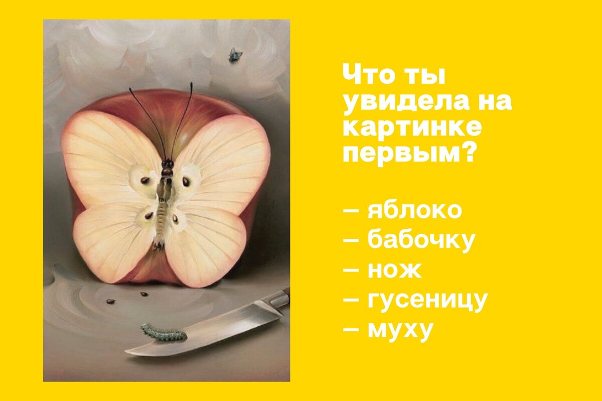 Просто ответьте, что первым увидели на картинке: нож, яблоко, гусеницу, бабочку или муху.
