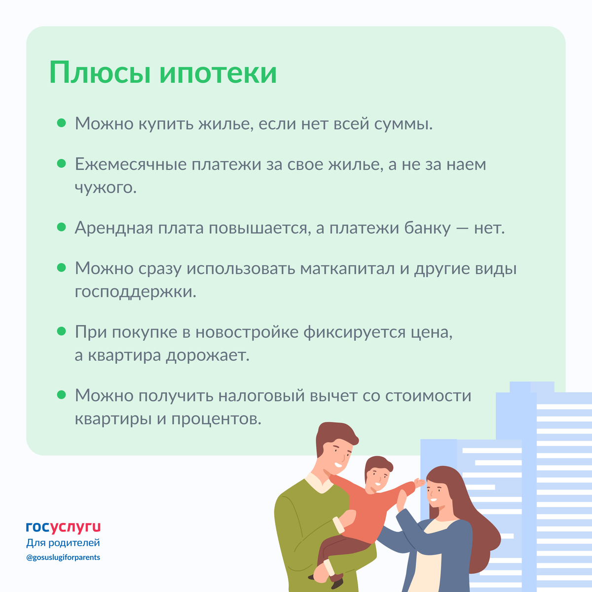Ипотека позволяет быстрее въехать в свое жилье, но при этом придется платить проценты за кредит. Кто-то считает кредит финансовым бременем, для других — это единственная возможность приобрести свое жилье. А некоторые на ипотеке даже зарабатывают. В этих карточках — преимущества и недостатки кредитов на покупку жилья. Условия льготной ипотеки — на сайте спроси.дом.рф. 🔸 Как получить отсрочку платежей по ипотеке в 2022 году @gosuslugiforparents