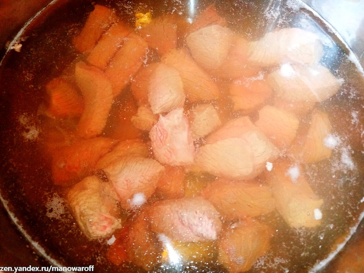 Сегодня, как видите, будем готовить гуляш с китайским акцентом. Гуляши я люблю в принципе, особенно сегедский, который, наверное, является моим самым любимым блюдом из всех. Так что, думаю, китайский вариант мне тоже понравится. Для приготовления нам понадобится: Мясо нарезаем небольшими кусочками, на один укус. С картошкой поступаем аналогичным образом. У помидора вырезаем место крепления к плодоножке и режем небольшими кусочками. В кастрюле доводим до кипения литра полтора воды, закидываем туда мясо и бланшируем его в течение пары-тройки минут. Откидываем мясо на дуршлаг, промываем холодной водой и оставляем, чтобы стекла вода. В воке разогреваем растительное масло и добавляем тростниковый сахар. Ждем, когда сахар расплавится, после чего кладем в вок чеснок с имбирем, а также пасту Тобадзян. Хорошенько перемешиваем. Кладем мясо и как следует перемешиваем, чтобы оно покрылось сахаром и пастой со всех сторон. Заливаем воду, чтобы она покрыла содержимое вока, добавляем столовую ложку ша