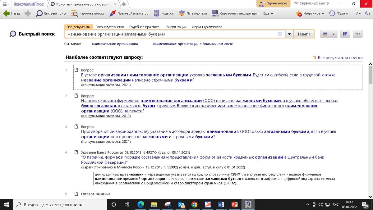 Вопрос: Допустимо ли, чтобы наименование предприятия в реквизитах кадровых документов (приказ о приеме, увольнении и пр.) было указано полностью заглавными буквами, если в Уставе наименование предприятия зарегистрировано прописными буквами? Ответ: В настоящее время отсутствуют разъяснения по поводу того, является ли ошибкой заполнение строчными буквами названия организации в трудовой книжке и других кадровых документах, если в уставе заглавные. Тем не менее, наименование организации - автора документа на бланке документа должно соответствовать наименованию юридического лица, закрепленному в его учредительных документах (уставе или положении). Поэтому, во избежание претензий проверяющих, лучше заполнять наименование организации-работодателя в кадровых документах в соответствии с учредительными документами. Пунктом 5.5 ГОСТ Р 7.0.97-2016 "Национальный стандарт Российской Федерации. Система стандартов по информации, библиотечному и издательскому делу. Организационно-распорядительная до