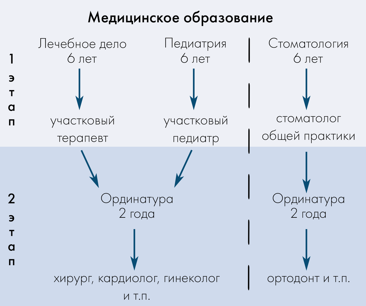 Базовое образование бывает 3 видов: лечебное дело, педиатрия и стоматология. Закончив базовое образование, ты становишься участковым терапевтом, участковым педиатром или стоматологом общей практики.