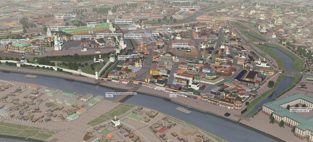 3D модель Москвы лета 1812 года создана нашей студией и доступна для просмотра. Смотрите также и другие исторические реконструкции Москвы. 3D модель Москвы 1812 года включает в себя белокаменный Кремль и Китай-город. Также можно рассмотреть многие постройки: Свайный Москворецкий мост и Москворецкие ворота Китайгородской стены. Застройка Васильевского спуска и Зарядья. «В 1789 году вместо «живого» моста был сооружен мост на сваях. Уже в XIX веке ему на смену пришел трехарочный мост на каменных опорах, но сами арочные пролеты были по-прежнему деревянными.» Кремль и Китай-город 1812 года — общий вид до пожара в 3D модели Москвы. Белокаменный Кремль 1812 года. «Впервые, в письменных источниках побелка Кремля упоминается в 1680 году. Зимний дворец Растрелли в Кремле и собор Спаса Преображения на Бору. После коронации, в 1798 г. по проекту Н.А. Львова было реконструировано сооружение В.В. Растрелли. Надстройка вторым этажом средней части набережного корпуса, и обработка фасадов в классическ