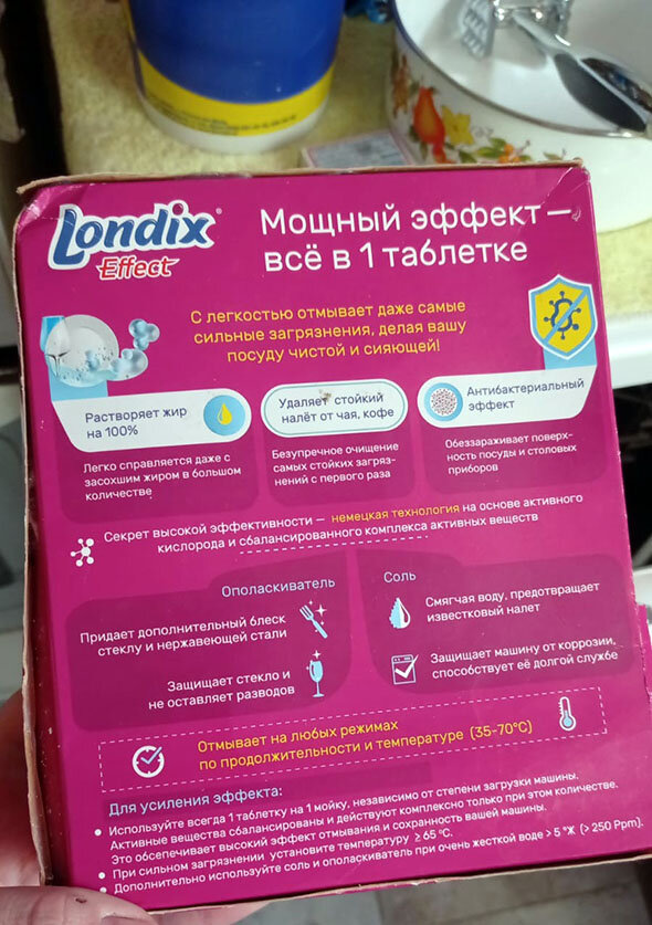Владельцы посудомоечных машин знают, как сложно бывает найти подходящее средство для мытья посуды. В моем активе, как минимум, пять марок, от которых я отказалась по разным причинам. Не устраивали меня сильный запах одних, слишком агрессивный состав других, качество мойки третьих… Но нашлись-таки таблетки для посудомоечной машины, которые меня полностью устроили. Какие? А вот эти: Londix показали себя с самой лучшей стороны: - они не пахнут химией, соответственно, и на посуде нет запаха моющего средства, - отлично справляются с самой «зажиренной» посудой, с присохшими остатками еды, со следами от кофе и чая, - растворяются полностью, в кювете я ни разу не видела остатков таблетки. Не остается белых разводов и на посуде, в том числе, из темного стекла, - состав не перегружен агрессивными компонентами. Приведу пару примеров. Вот так выглядели тарелка и миска до того, как я загрузила их в машину А теперь они же после мойки с таблеткой Лондикс Результат вы видите - посуда чистая, без пяте