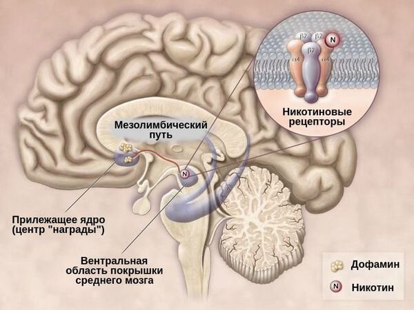 Раньше дофамин ошибочно относили к медиаторам удовольствия. На самом деле он является нейромедиатором желания, тяги. Дофамин отвечает за обучение. В данном случае он учит человека вновь и вновь хотеть очередную дозу никотина.