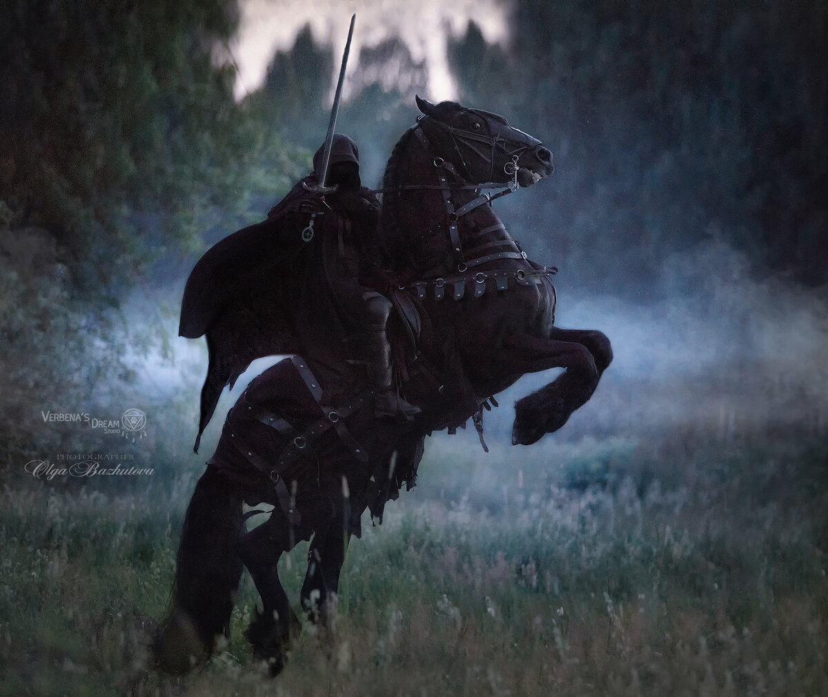 Люблю сердечно эту съемку, и уникальна она тем, что полностью её спродюсировав, я не выступала в роли модели - а доверила эту роль профессионалу, владелице этого прекрасного черного жеребца! Костюм, при кажущейся своей нехитрости, на самом деле был настоящим испытанием для всадника: многослойный черный плащ с объемным капюшоном, ниспадающем на лицо, амуниция для коня из кожи и попоны-рванины, также стремящаяся куда-то улететь и съехать постоянно в галопе, тяжелый полуторный меч в одной руке - и лишь вторая рука для упраавления коем на галопе! Помножим всё это на 35-градусную жару))) Любопытная деталь: маска на коне должна была быть другая. Но, когда я собирала сумки с реквизитом, я забыла маску на складе((( и обнаружила это уже по приезду на место съемки, когда мы начали одевать Фризо в амуницию. Я была очень раздосадована: назгулий конь с голой мордашкой это совсем не то что планировалось и сильно подорвано бы целостность образа((( Но меня выручила фотограф Оля Бажутова... угадаете к