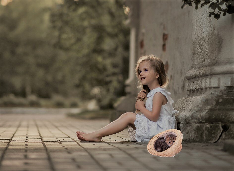 На следующий день субботним вечером он снова вышел на улицу и пошел по направлению к тому месту, где встретил вчера девчушку. Она сидела на лавочке и болтала босыми ногами. Рядом в соломенной шляпе все так же сидел котенок.