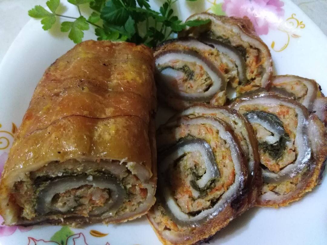 Выложить фарш с морковью и зелень с чесноком. Распределить по всей поверхности. Свернуть рулетом. Перетянуть ниткой или резинкой. Завернуть в два слоя фольги, выложить в форму.