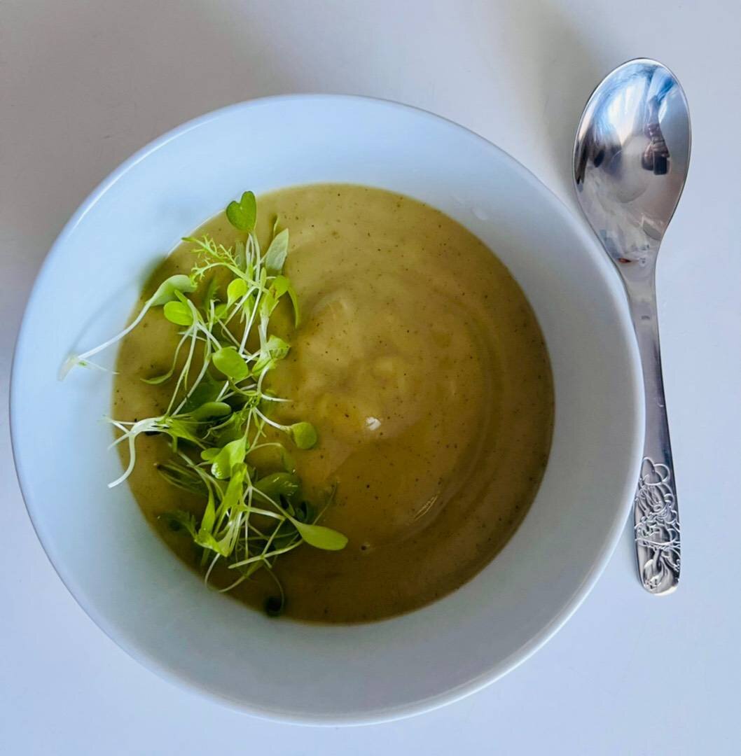 Ингредиенты: 🥦 брокколи свежей или замороженной, картофеля (3 крупные), большая 🧅 луковица, Соль, перец , Масло подсолнечное и сливочное для обжаривания лука Способ приготовления: Порезать кубиком и зажарить на небольшом количестве сливочного и/или подсолнечного масла луковицу прямо в кастрюле. Порезать картофель, разделить капусту на соцветия опустить в кастрюлю и залить литром воды. Варить все вместе около получаса, потом взбить блендером. Посолить, поперчить. Очень вкусно подавать со сметаной и с сухариками.