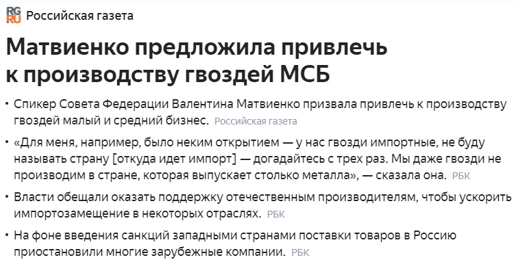 Валентина Матвиенко удивилась, что даже гвозди в России импортные. И тут же, "власти пообещали оказать поддержку". Мне хочется спросить, а где вы были восемь тридцать лет? Это вроде модный сейчас вопрос, искать виноватых в прошлом. Это что получается. Сверхдержава, плавающая в природных ресурсах, выкачивающая миллионы тонн нефти, газа, руды, золота и алмазов, не в состоянии наладить небольшой современный заводик по производству гвоздей? Мда. Что это - глупость или реальная оторванность избранных "руководителей" в Москве от остальной России? Или может Матвиенко тоже докладывали, мол, все шикарно, все делаем сами, ничего импортного. А как поставки закрыли, так и гвозди закончились? Гвозди?.. Как же это нелепо и смешно. Ход за вами, комментаторы-импортозаместители. Самое время показать себя. Стукнуть кулаком в грудь, да и построить завод в чистом поле. Из отечественных станков. Из отечественных комплектующих. Из отечественного софта. Полный цикл. Покажем западной гадине, что у русског