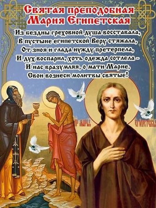 14 апреля Этот день в народном календаре Дата по старому стилю: 1 апреля. В этот день церковь чтит память преподобной Марии Египетской — христианской святой, которая считается покровительницей кающихся женщин. Мария родилась в Египте в середине 5 века. В возрасте 12 лет она покинула родителей и ушла в Александрию, где стала блудницей. Однажды она попыталась войти в храм Гроба Господня вместе с группой паломников, но какая-то сила удерживала ее и не впускала внутрь. Тогда Мария осознала свое падение и стала молиться перед иконой Богородицы, находившейся в притворе храма. После этого она свободно вошла в храм. Вскоре после этого Мария приняла причастие и поселилась в пустыне, где прожила 47 лет в полном уединении, посте и покаянных молитвах. К Марии Египетской в народе было принято обращаться за защитой от сглаза и дурного слова. Также считалось, что женщине или девушке в этом мог поспособствовать такой прием: нужно было, погладив себя рукой по заду, затем потереть той же рукой по л