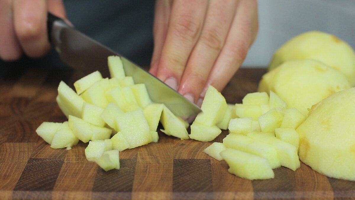 Для начала мелко нарежем 2 яблока, кожицу снимаем.