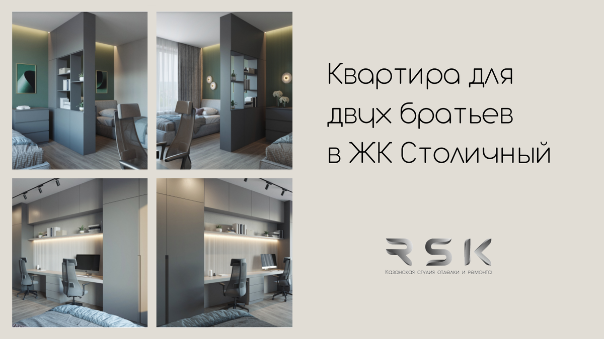 К нам обратились заказчики из другого города, они только что приобрели квартиру в ЖК Столичный для сыновей, поступивших учиться в Казань. Перед нами встала задача создать дизайн-проект комфортной квартиры для двух молодых людей и воплотить его в жизнь. Пообщавшись с заказчиками мы остановились на понятном современном стиле, текстурах дерева и бетона, преобладании светлых тонов в интерьере. Просторную спальню разделили перегородкой с полками, чтобы у каждого молодого человека появилось уединенное пространство. Продумали два рабочих места и систему встроенных шкафов, где места хватит для всего. Вторую спальню было решено оформить как гостевую, для родителей, которые будут приезжать в гости. Обратите внимание на несколько сценариев освещения. В зависимости от времени суток, можно выбрать уютный приглушенный свет или яркий основной. Гостиная объединена с кухней, выделены обеденная зона и зона отдыха. Мы использовали натуральные текстуры дерева в кухонном гарнитуре и настенных панелях, и с