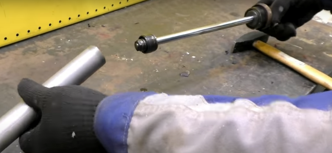 Для начала необходимо разобрать стойку, разрезав упорную крышку цилиндра болгаркой. Отсюда берем только поршень и внутреннюю трубку.