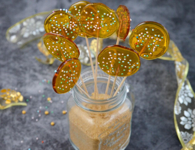 Яркие, веселые, сладкие домашние карамельки! Сделать леденцы в домашних условиях проще простого. Понадобятся только сахар, вода и немного лимонного сока. Не нужны даже формочки, карамель будет отливаться ложкой. Дети смогут полакомиться сладостью без вреда для здоровья! Ингредиенты: Сахар-6 ст.л Вода-2 ст.л Лимонный сок-0,75 ч.л Приготовление: ШАГ 1: Подготовьте продукты для карамели. ШАГ 2: Также приготовьте деревянные палочки, на которые будете насаживать леденцы. Для этой цели хорошо подойдут деревянные шпажки. Если они слишком длинные, разрежьте их пополам. Подготовьте бумагу, на которой будет сушиться карамель. Лучше всего подойдет тефлоновый коврик. Если его нет, возьмите обычный пергамент и хорошо смажьте его растительным малом без запаха. Я еще использовала кондитерскую посыпку для украшения. ШАГ 3: Возьмите сотейник с толстым дном. Положите в него сахар, налейте воду и лимонный сок. Перемешайте. ШАГ 4: Поставьте сотейник на огонь. Помешивая лопаткой, дождитесь полного раст