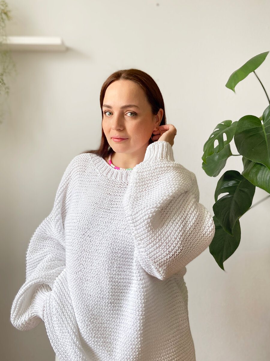 Белый, белоснежный, идеальный Без ложной скромности хочу поделиться очередным выполненным заказом. Немного предистории. Моя заказчица - яркая молодая леди. Всегда у нее идеи с изюминкой и мне, как мастеру, безумно интересно выполнять ее задумки! Кто подписан на мой канал, видел умопомрачительный кардиган из мохера на шелке. Кардиган тут В этот раз в планах появился овер на летние прохладные вечера, чтоб укутаться и согреться и при этом быть в центре внимания! Клиент скинул мне фото и мы обсудили, что меняем. На фото то, что прислала заказчица. То, что в итоге получилось - пожелание клиента. Заменили высокую горловину на V-образный вырез и возможность носить на две стороны. Итогом, я довольна! Подробнее про пряжу: Для джемпера оверсайз из хлопка я выбрала Yarn Art Jeans Plus. 55 хлопок и 45 полиакрил. Метраж 160 м в 100 г. Вязала спицами 4.5 и 5.0 мм. От 100% хлопка отказалась сразу. Акрил в этом случае облегчает вес изделия, плюс это не нательная вещь, акрил допустим. Работать с