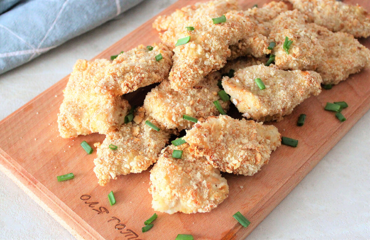 Готовя по этому рецепту куриную грудку я не ожидала ничего особенного, но получилось не только вкусно, но и сочно. А главное готовить очень легко, да и времени мало уходит. Такое мясо можно подать к любому гарниру, да и просто с каким-нибудь соусом, очень вкусно! Куриную грудку нужно нарезать небольшими кусочками, толщина каждого кусочка должна быть не более 1 см. Мясо нужно посолить со всех сторон, можно добавить любимых специй. Пока оно маринуется можно заняться приготовлением панировки. Для этого подготавливаем ингредиенты: муку насыпаем в отдельную тарелку, яичный белок взбиваем, панировочные сухари тоже стоят рядом и ждут своего часа. Панировочные сухари лучше взять домашние, и они не должны быть слишком мелкими. Теперь каждый кусочек мяса окунаем сначала в муку и стряхиваем излишки. Затем окунаем в яичный белок, а потом уже и в панировочные сухари, щедро. Выкладываем подготовленные кусочки мяса на противень и отправляем в уже разогретую до