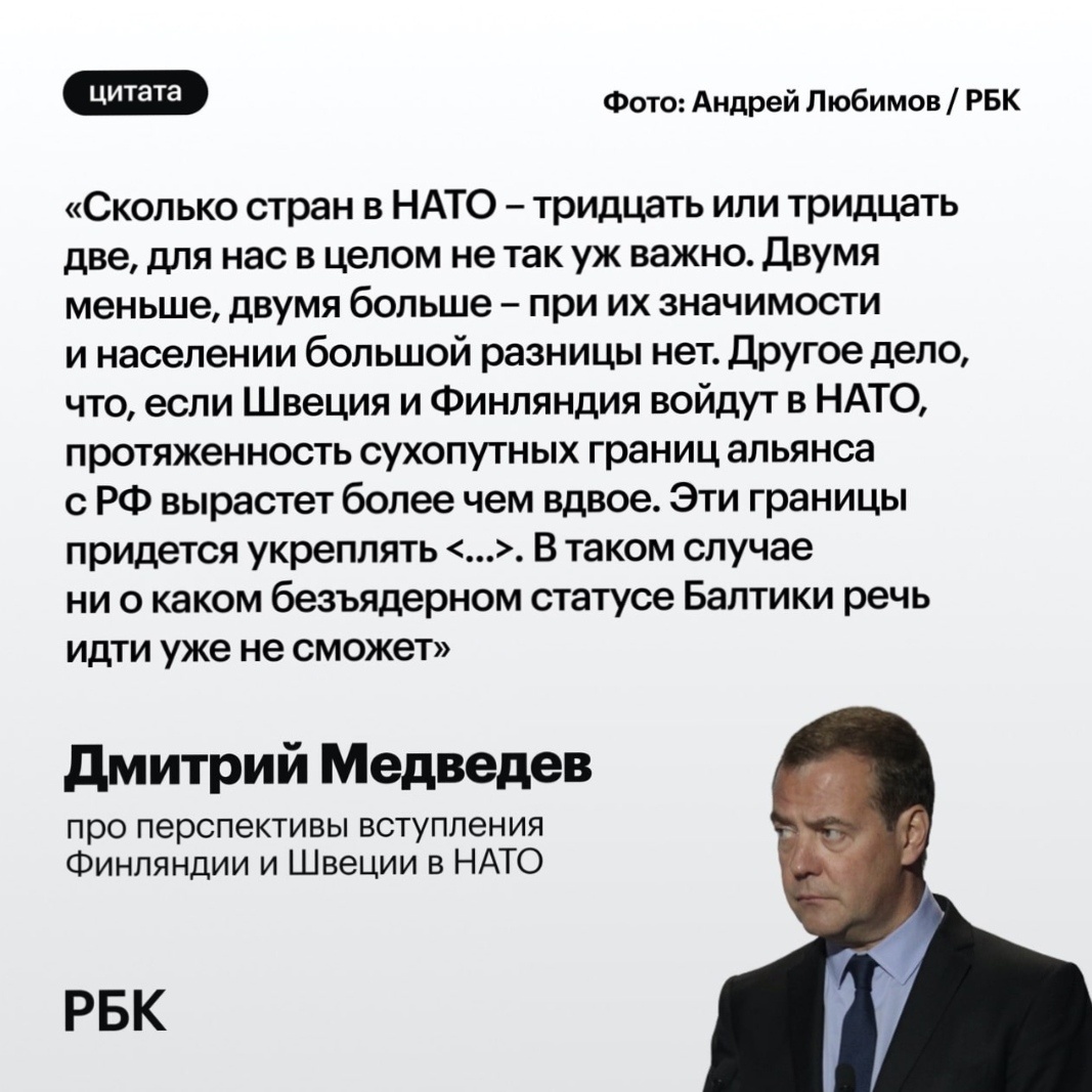 Дмитрий Медведев рассказал, чем Россия ответит в случае вступления Финляндии и Швеции в НАТО. В этом случае, по его словам, России придется укрепить границы — усилить группировку сухопутных сил и ПВО на северо-западных границах, развернуть военно-морские силы в акватории Финского залива. «В таком случае ни о каком без ядерном статусе Балтики речь идти уже не сможет», — подчеркнул Медведев. Нет смысла рассуждать, о влиянии спецоперации на планы этих стран вступить в НАТО, считает замглавы Совбеза. «Во-первых, попытки затащить их в альянс предпринимались и раньше. И, во-вторых, что главное — у нас нет с этими странами территориальных споров, как с Украиной. А поэтому цена такому членству для нас разная», — пояснил Медведев.