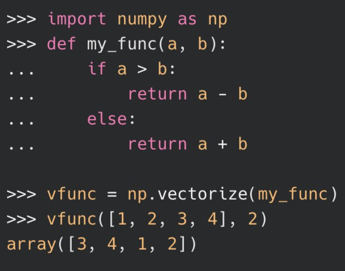 Одним из приемов для ускорения работы циклов является векторизация вычислений, т. е. использование функций, которые поддерживают операции над векторами. Вообще лучший способ ускорить любой цикл – это отказаться от него. В примере выше для работы с функцией my_func мы могли бы вызвать ее в цикле для каждого элемента списка, но гораздо проще использовать vectorize. По сути, vectorize преобразует функцию таким образом, что она начинает принимать весь вектор целиком, а не отдельный его элемент. Надо помнить, что такой подход не всегда приводит к значительному ускорению. Аргумент сигнатуры позволяет векторизовать функции, которые представляют собой массивы фиксированной длины. Например, вы можете использовать его для векторизованного расчета коэффициента корреляции Пирсона и его значения Или для такой векторизации : #vectorize #numpy