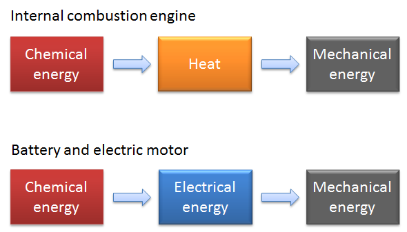 Обратите внимание, что КПД при преобразовании химической энергии в механическую в электромобиле гораздо выше, так как потери энергии в АКБ и электродвигателе относительно невелики.