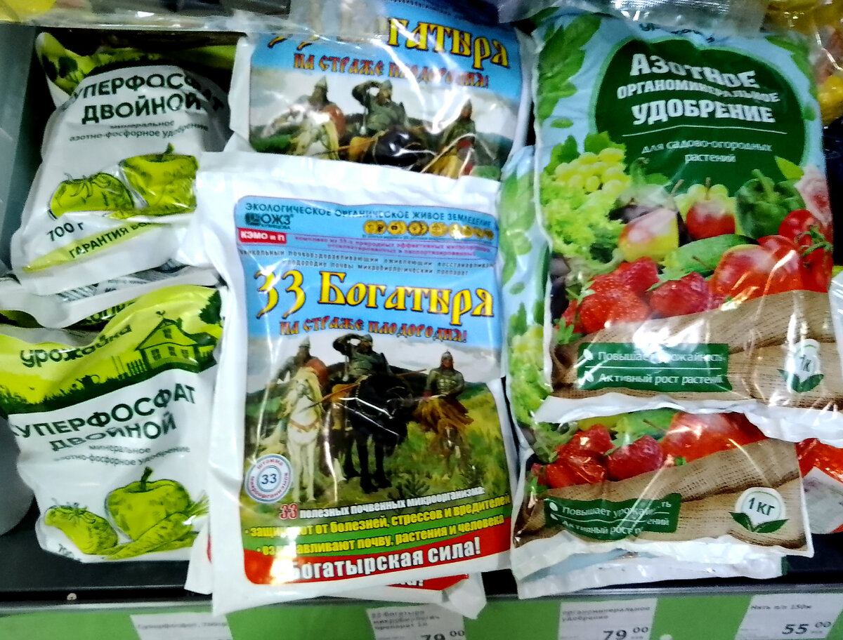 Большой выбор удобрений и средств для растений. Удобрения фасовкой 0,7-1,0 л: суперфосфат двойной, азотное удобрение и удобрение 33 Богатыря - уникальный почвооздоравливающий, оживляющий, восстанавливающий плодородие почвы микробиологический препарат, содержащий более 40 штаммов полезных почвенных микроорганизмов на органическом и минеральном носителе. Стоит отметить, что суперфосфат двойной и азотное удобрение в магазине Светофор намного дешевле (см здесь).