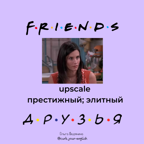 В 9 сезоне Моника становится шеф-поваром в очень крутом ресторане. Фиби в свою очередь решает помочь подруге и самой себе, начиная петь свои песни перед посетителями ресторана Моники. Посетителям творчество Фиби особо не нравится. Монике тоже. Моника не выдерживает и сообщает Фиби, что ее ресторан sort of an upscale place. Что же такое upscale? Пройдемся по оригинальному тексту из сериала. Monica: Oh...Phoebe? Maybe I wasn't clear before. I really love listening to your music here, but my restaurant is sort of an upscale place. Phoebe: Right, yeah, ok, I'll ask the butler to fetch my diamonds out of the vault. Моника: О... Фиби? Может быть, я ранее не ясно пояснила. Мне очень нравится слушать твою музыку здесь, но мой ресторан - это высококлассное место.