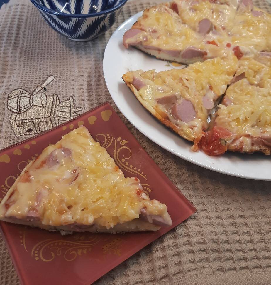 Ингредиенты: яйца, муки, сметаны, Соль , сосиски, сыра, Кетчуп , помидор