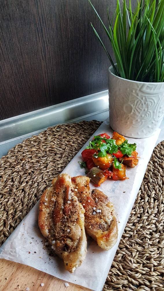 Ингредиенты: Стейк бедра индейки, Соль , Перец , Растительное масло, Тёплый салат с баклажанами🍆, Кетчуп, Перец чили мини, Кунжутные семечки, Соль, Кинза, Кукурузный крахмал, Растительное масло, Помидоры черри, Баклажан, Лимон, Мёд