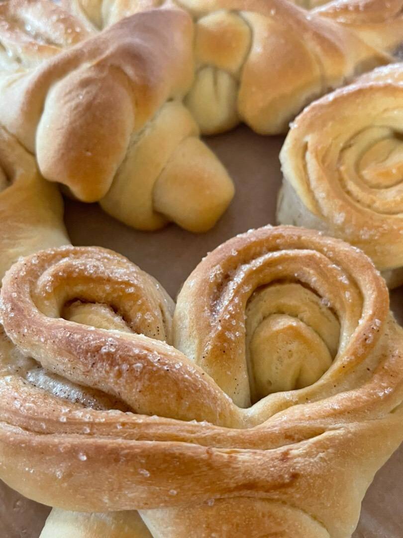 Формируем булочки в виде сердечек. Для этого кусочки теста (80 гр) раскатываем на кружочки, наносим кисточкой растительное масло, подсыпаем сахаром, складываем в рулет, соединяем два края и разрезаем жгут посередине.