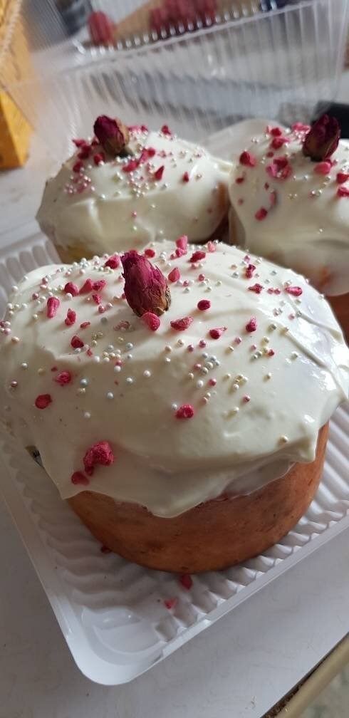 Взбиваем до пик. Главное не перевзбить. Эта глазурь после высыхания крошиться при нарезании. Но она вкусная. Сразу украшаем куличи и присыпкой.