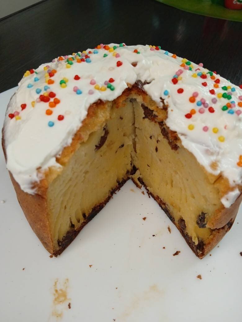 В тесто добавляем масло, изюм и перемешиваем венчиком. Выливаем тесто в формочку и отправляем в разогретую до 180 гр духовку на 40 минут (или ориентируйтесь по своей). Полностью даём остыть и покрываем творожком и посыпкой