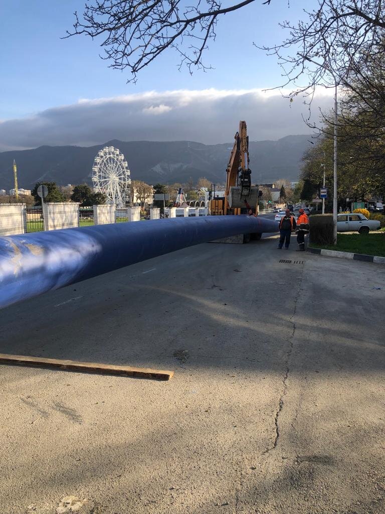 13 апреля стартовала затяжка трубы нового коллектора под землей по улице Кирова. На этом участке был подготовлен горизонтальный прокол диаметром 900 мм на глубине 4-х метров. В него затянуто порядка 50 метров канализационной трубы из полиэтилена низкого давления (ПНД).