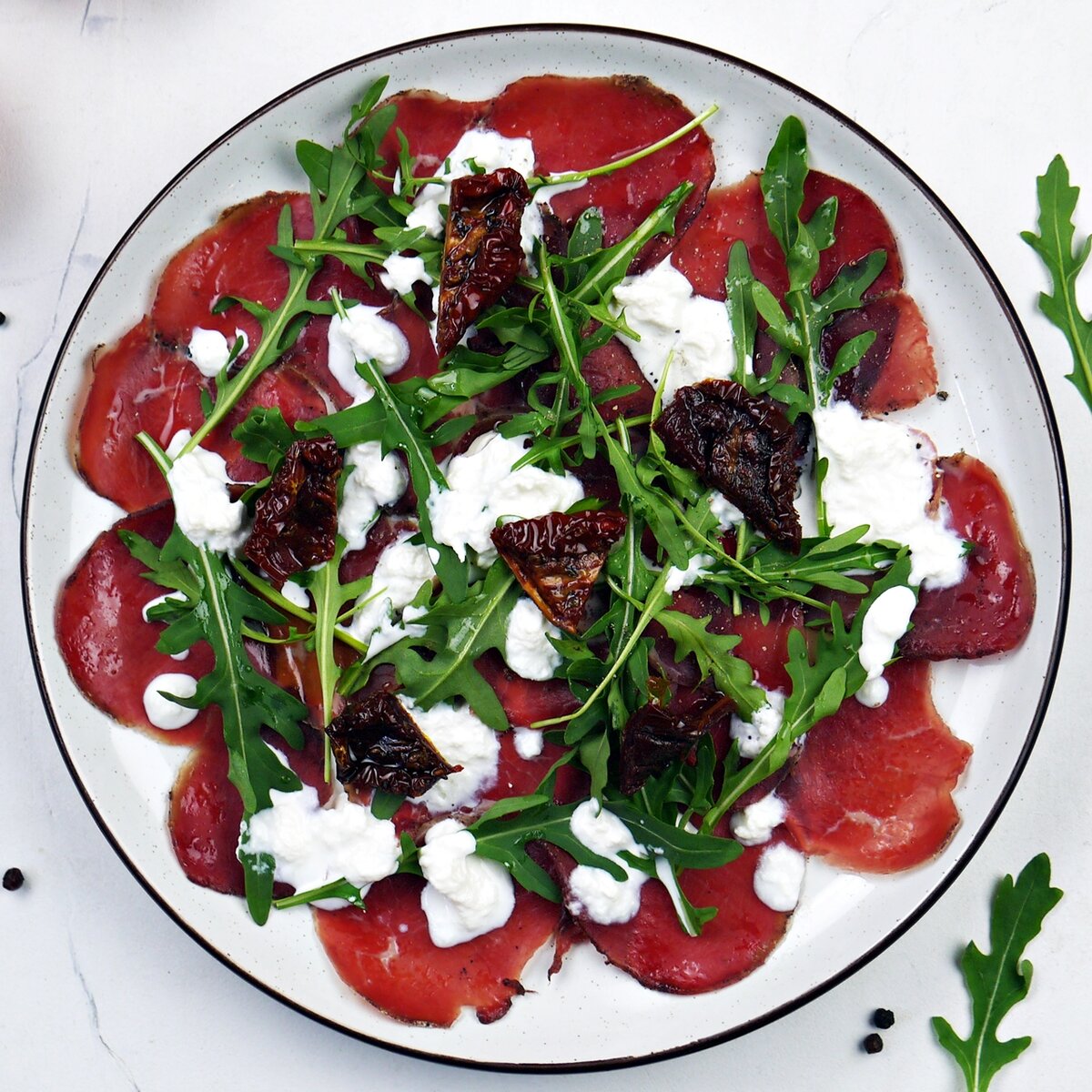 🌟 БРЕЗАОЛА (холодная закуска) - итальянская сыровяленная телятина со страчиателлой и свежайшей рукколой.