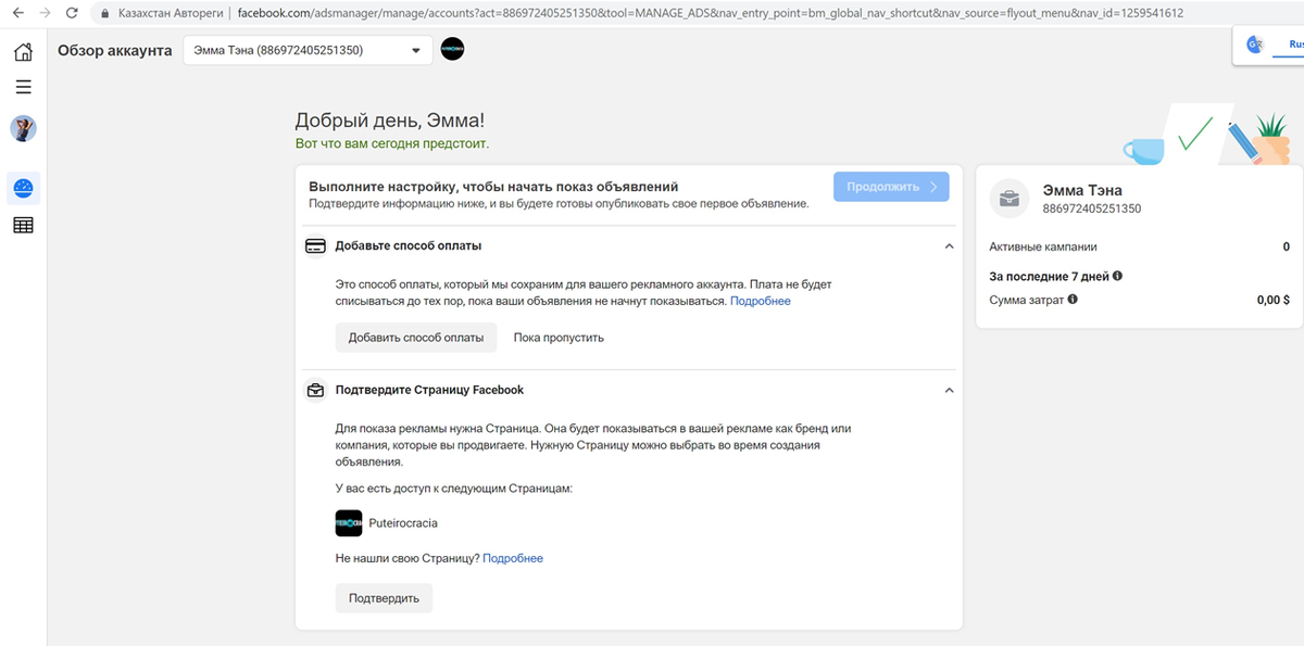 Когда вы впервые попадаете в Ads менеджер, то он может вам предложить выполнить пошаговую настройку, для этого вам необходимо ввести платежные данные карты, и подтвердить страницу.