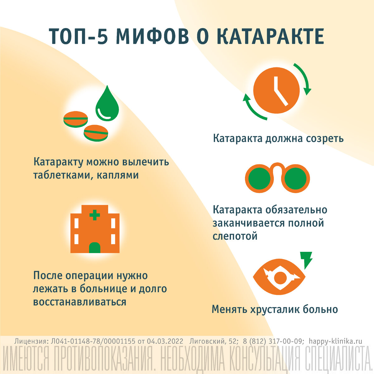 Правда: болезнь развивается медленно и не обязательно заканчивается потерей зрения. Но все же необходимо наблюдаться у врача и вовремя сделать операцию по замене хрусталика.