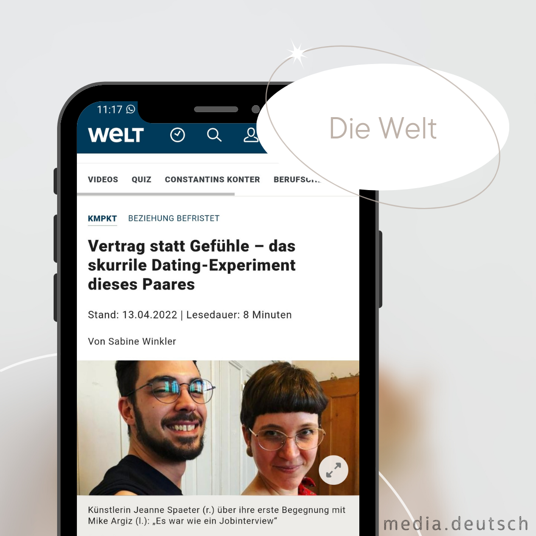 📰 Они познакомились в Тиндере и виделись лишь три раза - пара из Берна решила заключить договор на отношения. Точнее, такую идею предложила девушка. В договоре подробно расписали всё: от количества времени, которое они должны проводить вместе (в часах!), до совместного отпуска. Так можно ли влюбиться в друг друга, заключив договор? Спойлер: нет - ну, по крайней мере это показал эксперимент (из договора вышел молодой человек). Но был и положительный опыт. Об эксперименте рассказывает в своей публикации Die Welt. ✍️ ✔️ nach dem oder der Richtigen suchen – искать подходящего, "своего" человека ✔️ eine Familie gründen – создать семью ✔️ eine Beziehung eingehen – вступить в отношения ✔️ jemanden daten – встречаться с кем-либо ✔️ etw. aus einem anderen Blickwinkel betrachten – посмотреть на что-либо под другим углом ✔️ die Berührungspunkte, die Anknüpfpunkte – точки соприкосновения ✔️ unter strikten Bedingungen – при соблюдении строгих условий ✔️ Einhaltung der Vertragsbedingungen