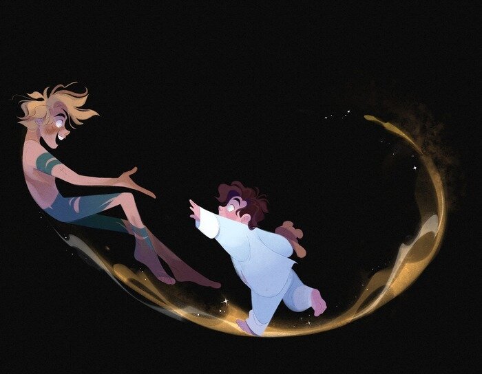 Давайте вспомним, с чего начинается история и какие в ней есть ключевые моменты, которые будут нам важны для сегодняшней беседы. В семье Дарлингов трое детей — старшая Венди, Джон и младший Майкл. Однажды вечером миссис Дарлинг, которая пришла пожелать детям спокойной ночи, видит, как в окно влетает мальчик, а за ним — странное светящееся пятно. Она вскрикивает, и на ее голос прибегает огромная собака-водолаз по кличке Нэна. Мальчишке удается сбежать, но в зубах собаки остается его тень. Миссис Дарлинг свертывает ее и укладывает в ящик комода. Через несколько дней, когда родители уходят к гости, снова прилетает Питер вместе с феей Динь-Динь. Они находят тень, но она никак не прикрепляется на место, из-за чего Питер начинает громко плакать. Его рыдания будят Венди, и она пришивает тень к пяткам Питера. Почувствовав доверие к Венди и узнав, что она умеет рассказывать сказки, Питер посыпает волшебной пыльцой девочку и ее младших братьев, и вместе они направляются в страну под названием Не