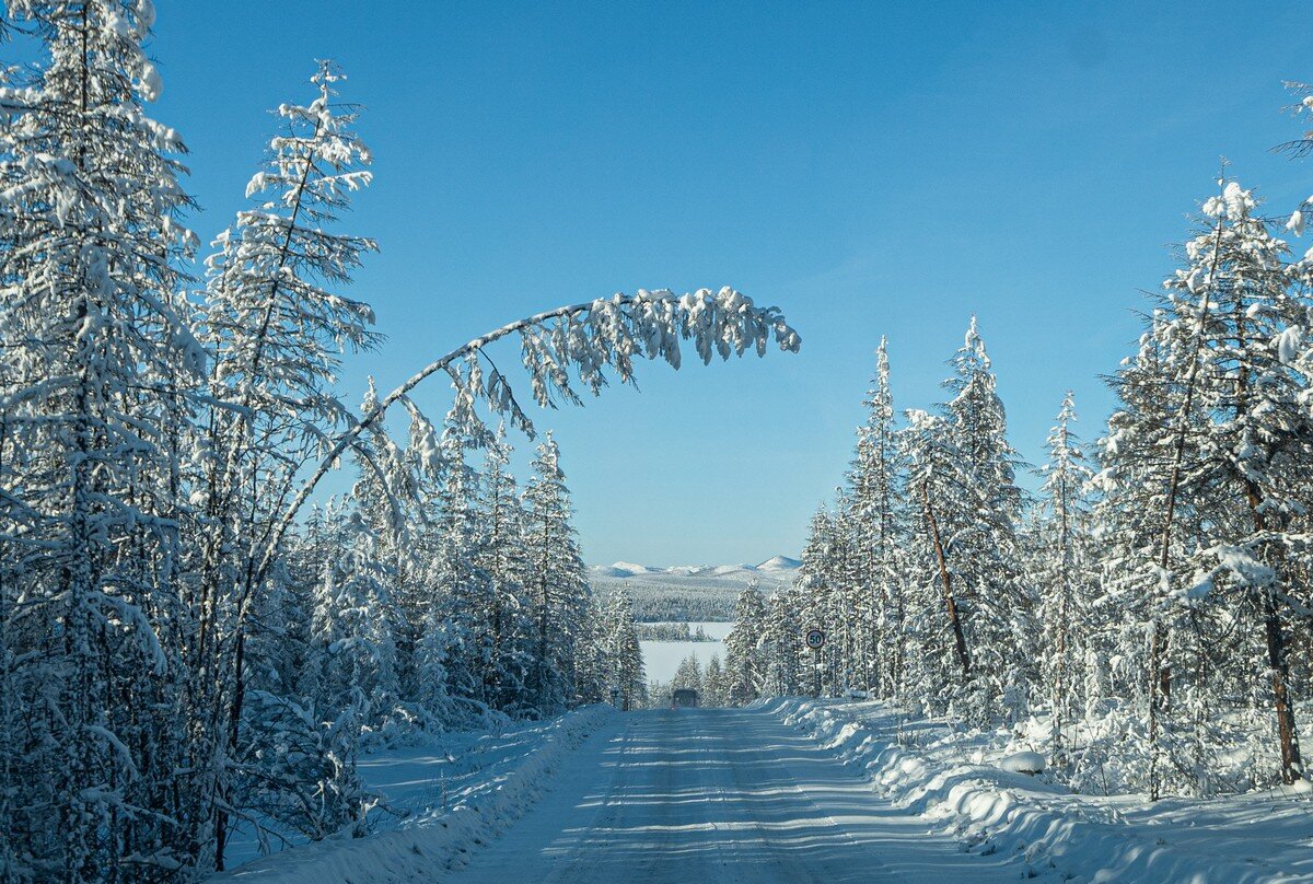 Знакомство [очередное] с Оймяконом закончено, пора двигаться дальше — впереди 470км по карте (500 по факту наезда) до следующей ночёвки в посёлке Хáндыга (ударение на первое ‘а’). Дорога весьма красочная, до основной трассы 150км по снежному лесу (который позавчера в сумерках проехали), затем 200+км по обалденной зимней горной дороге, а завершающие 100км уже по немного скучным равнинным пейзажам. В солнечное время суток всё смотрится гораздо позитивней! Примерно вот так: