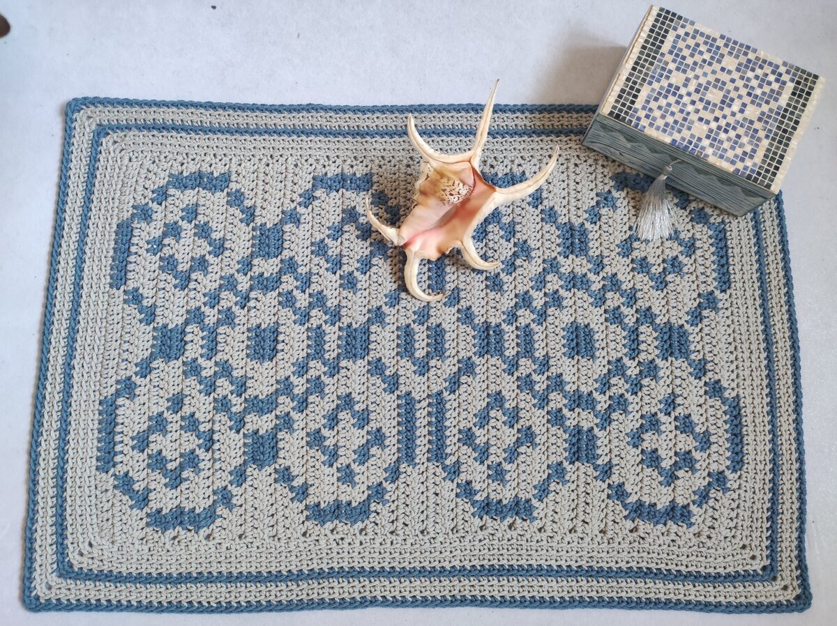 Всем привет! Этот коврик связан из пряжи "Камтекс толстый хлопок" в технике жаккард. Коврик вяжется очень просто и быстро. Я связала его за два вечера! Набрала 44 воздушных петли и две петли подъёма. Рисунок начала вывязывать с первого ряда. Когда полотно с орнаментом закончила, приступила к обвязке столбиками без накида. Получилось 7 рядов. Готовое изделие было оценено по достоинству))