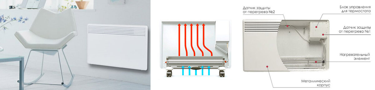 В корпусе электрического конвектора находится нагревательный элемент, от которого прогревается холодный воздух, поступивший внутрь прибора. Далее нагретые воздушные потоки выходят через отверстия в верхней части корпуса и поднимаются вверх. Они вытесняют более тяжелый холодный воздух вниз, где он снова поступает в конвектор. Этот процесс называется «естественная конвекция». Конвекторы равномерно прогревают помещение, но для этого понадобится некоторое время. Скорость нагрева зависит от объема комнаты и мощности прибора.