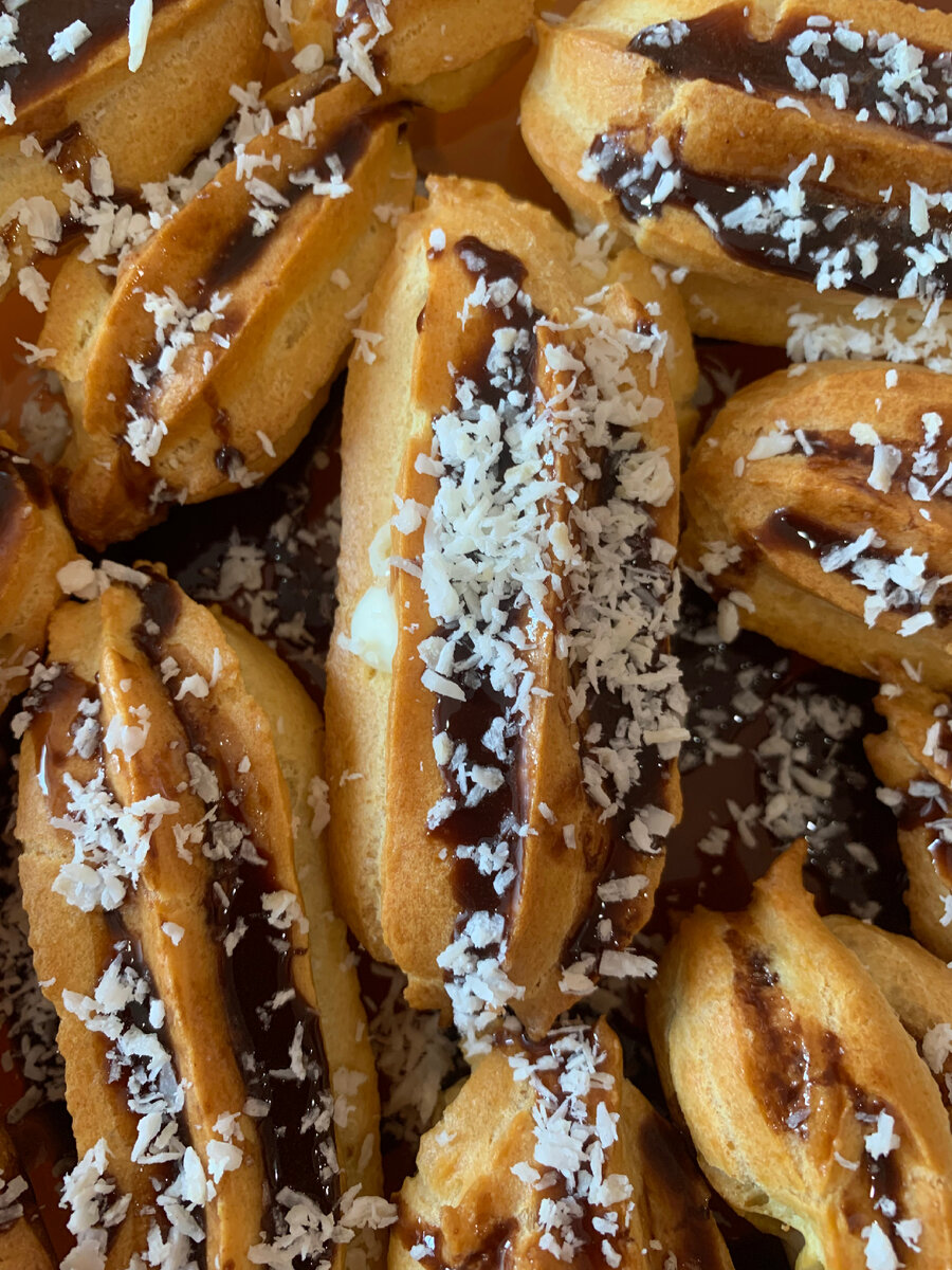 Я в выходной попробовала сделать эклеры по классическому рецепту. Получилось очень вкусно и нежно. Моя семья оценила. Делюсь рецептом: Тесто: Налить в кастрюлю воды, добавить туда масло и соль. Нагреть до кипения, перемешать, растопить масло. Затем всыпать муку, тщательно размешивая деревянной лопаткой, чтобы не образовались комки. Прогревать в течение 3 минут, тесто должно немного потемнеть, и снять с огня. После этого заварное тесто немного остудить, примерно до температуры 70 градусов. По одному добавлять яйца, каждый раз хорошо вымешивая тесто до однородности. Тесто получается довольно густое. Разогреть духовку до 180 градусов. Тесто поместить в кондитерский мешок с насадкой (или в конусообразный пакет, свернутый из плотной бумаги, с отверстием на конце). Выложить тесто на противень в виде небольших пирожных удлиненной формы, я делала полосочки длиной 5-6 см. Нужно учитывать, что примерно тесто увеличится в 3 раза. У меня получилось два противня. Примерно 30 пирожных. Затем пр