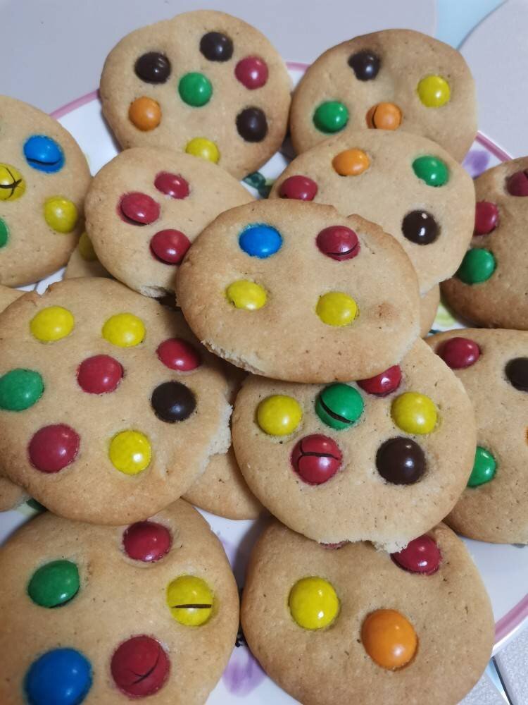 Очень вкусные расыпчатые печеньки с шоколадными конфетками m&m's 10 из 10! Ингредиенты: сливочное масло, сахар, мука, разрыхлитель, яйцо, соли, большая пачка m&m's Способ приготовления: Размягченное сливочное масло взбиваем с сахаром до пышности и до белого цвета. Можно использовать сахарную пудру. Добавляем яйцо, соль и продолжаем взбивать. Муку смешать с разрыхлителем и в три приёма добавлять к масляной смеси. Смотрим на тесто, оно не должно быть слишком мягким или слишком плотным. Готовое тесто отправляем в пакете в морозильник на 10 минут. Далее из теста формируем шарики и кладём на противень с пергаментом. Придавливаем шарики и сверху украшаем m&m's. Противень с печеньем отправляем в духовку при температуре 180 градусов на 10-15 минут. Печём до румяности. Приятного аппетита!