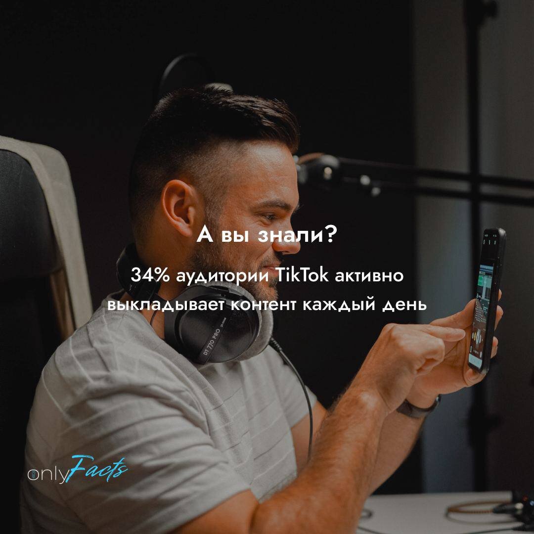34% аудитории TikTok активно выкладывает контент каждый день Уровень активности в TikTok значительно выше, чем на других социальных платформах. Около 34% всех пользователей ежедневно публикуют минимум одно видео. Как и в других соцсетях, чтобы нарастить аудиторию, здесь нужно регулярно что-то выкладывать. TikTok дает пользователям органический охват — даже если на вас никто не подписан, ваш контент может стать вирусным, и его увидят миллионы. У платформы довольно точные алгоритмы, и она показывает людям то, что они хотят увидеть. Если другим нравится ваш контент, то вас ждет быстрый прирост аудитории. Если же вы предпочитаете быть наблюдателем, скорее всего вы проводите в приложении более 50 минут в день, ведь TikTok — очень залипательная платформа, некоторые могут даже часами смотреть на ней короткие ролики. Основатели приложения сделали все, чтобы удержать пользователей — и им это удалось.