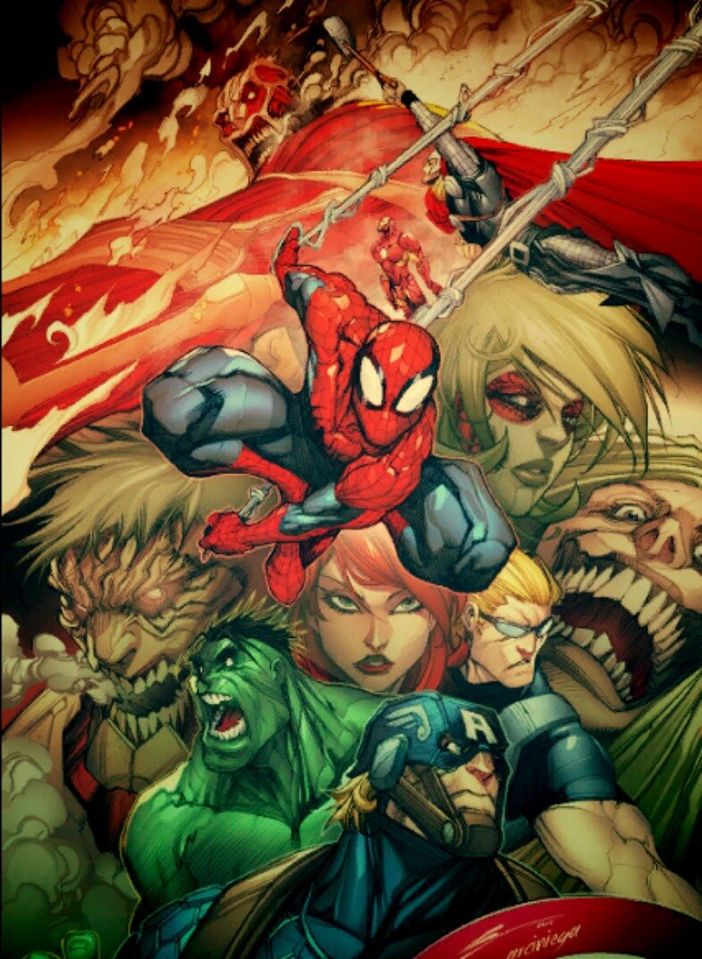 Данный комикс вышел из под пера Честера Цебульски и Хадзимэ Исаямы в 2014 году , что стало первым кроссовером для вселенной Титанов. Вторжение Сюжет развязывается в Манхэттене, разрушения идут дождем по всему городу. Титаны начали захватывать город и пожирать местных жителей, охватывая все великой паникой. Мстители и Щ.И.Т сразу приняли сигнал о внезапно новой угрозе. Тони Старк первым отреагировал на гигантских хищников. Эти деформированные великаны, со своими застывшими улыбками атаковали любого кто появляется на виду. По данным Марии Хилл, эти великаны просто вышли своей ордой из моря, сразу нацелясь на город. Человек Паук Тем временем, Человек Паук сражался с двумя малыми титанами на Таймс-Сквер. Безумные великаны постоянно промахивались по Питеру, пытаясь его сожрать. Человек Паук не понимал что происходит, просто пытаясь поговорить с ними в с