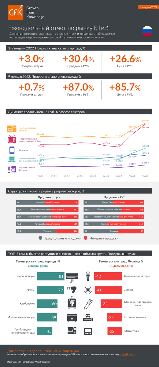 Мы запустили новую инициативу, Еженедельный отчет о текущей ситуации на рынке Бытовой техники и Электроники. Каждую неделю мы будем публиковать последние данные, чтобы вы могли понять, что происходит сейчас на разных рынках на уровне категорий, а так же как меняется покупательская активность. Telegram канал GfK Россия